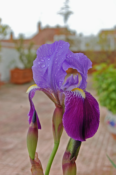 Esta flor sorprende por su belleza. La planta en la que ha nacido no es espectacular, de grandes hojas de un verde sugestivo. Son lanceoladas, de un verde normal y corriente y escasa altura. Pero de repente, sin que haya alguna norma establecida -hay años que no sale ninguna flor- nos sorprende con una como la que vemos. El lirio y las gotas de agua pueden relajarnos unos segundos… que buena falta hace con la que esta cayendo.
