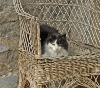 Este otro gato estaba en Lastiesas Altas, un lugar atractivo como pocos pese a lo escaso de su volumen. El animal estaba tranquilament tomando la fresca sobre un sillón de mimbre en el pórtico de la iglesia de esta localidad. No estaba muy contento con el visitante y siguió atento sus movimientos hasta que se cansó y siguió dormitando.