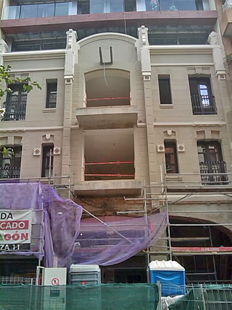 Las obras del nuevo edificio de Casa Coll se acercan a su recta final, según se puede observar en la oscense calle de Zaragoza, donde se rehabilita la fachada original del inmueble. Se están retirando los andamios y, así, las cerámicas, forja y muros recuperan una imagen semejante a la que pudieron tener cuando se construyó hace un centenar de años.
