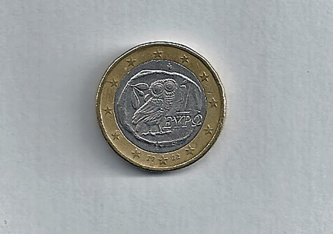 Esta mañana, en la panadería, me hen devuelto un euro. Nada sorprendente si entregas más dinero del que cuesta el producto. Pero resulta que la moneda en cuestión venía de Grecia, a juzgar por la imagen que vemos en esta foto. Un euro de Grecia. Casi parece un chiste de Chiquito de la Calzada que comenzara «ese pedazo de euro griego que llega a Huesca y dice… no puedor…». Los problemas de la sociedad griega o la española no lo son para esta moneda que ha viajado de un extremo a otro del Mediterráneo superando recesiones, rescates y todos los avatares económicos que atenazan al sur europeo.