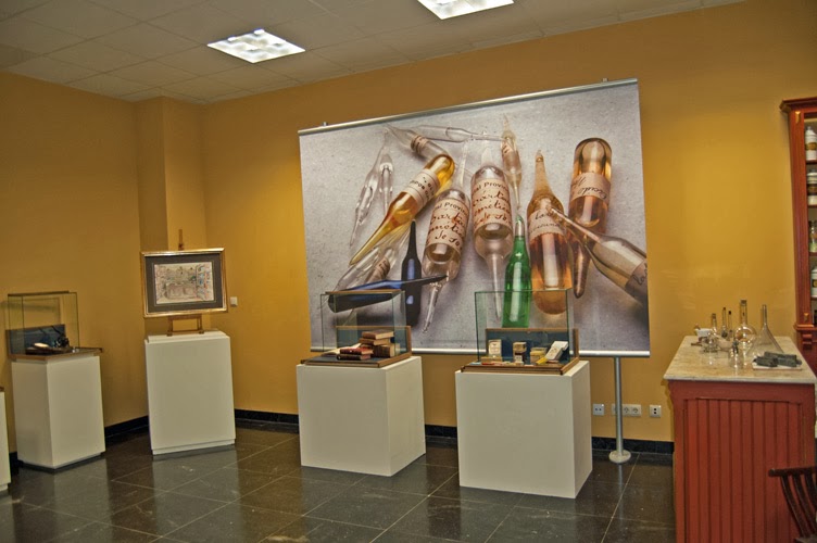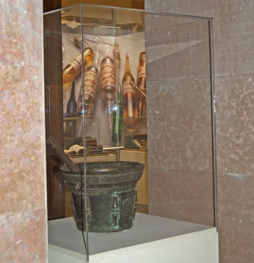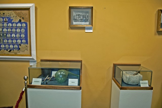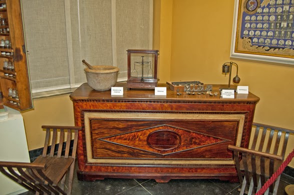| Mostrador de la botica de Sena con algunos útiles utilizados en la elaboración de medicamentos |