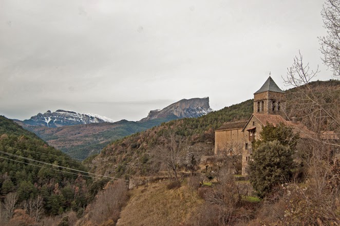 | La parroquial de Badaín a la derecha y, al fondo, Castillo Mayor y Sestrales |