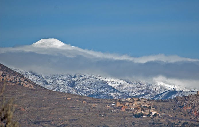 | La cima de Guara sobresale de la bufanda de nube que oculta sus laderas. Santolaria (o Santa Eulalia la Mayor) vigila la plana oscense |