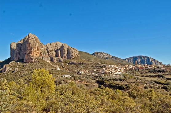 La imagen típica de Agüero es la que se obtiene al llegar al pueblo, desde la carretera de Ayerbe. Los mallos aparecen como telón de fondo y las casas con la parroquial, en primer plano. Aquí cambia la orientación. Vamos a la ermitade la Virgen del Llano -se toma un desvío señalizado en el camino a San Felices- y los mallos se compactan y aparecen más viviendas. Es diferente.