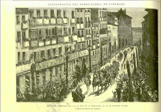 Huesca vivió los días 22 y 23 de octubre de 1882 unas jornadas de intensa actividad. El primero de estos días vino a Huesca el rey Alfonso XII para poner la primera piedra de las obras de la línea del ferrocarril a Canfranc. Como antesala de lo que sería nuestro «canfranero», la cosa fue más bien lenta. Las obras efectivas tardaron varios años en comenzar. El tren no llegó a Jaca hasta 1893 y el ferrocarril internacional no se inauguró hasta el 18 de julio de 1928. Entonces reinaba ya Alfonso XIII. Por cierto, en las crómicas de esos días se hablaba de que Alfonso XII había colocado la primera piedra de la nueva estación de ferocarril para Huesca, pero de eso nunca más se supo.