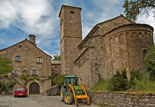 La entrada 200 de este blog nos lleva a un atractivo lugar de la Jacetania. Cuando se llega a Banaguás, localidad muy cercana a Jaca, lo primero que vemos es esta imagen. La casa abadía y la iglesia componen uno de los rincones más curiosos del entorno jaqués. Luego, cuando te enteras de que, en la primera, unas ventanas de la casa llegaron de un pueblo y otra con la puerta de una segunda localidad, dudas un poco, pero al final se impone la imagen y el conjunto tan entonado que forman. Me parece. El tractor le da un toque rural al conjunto y el turismo un poco de vida cotidiana.