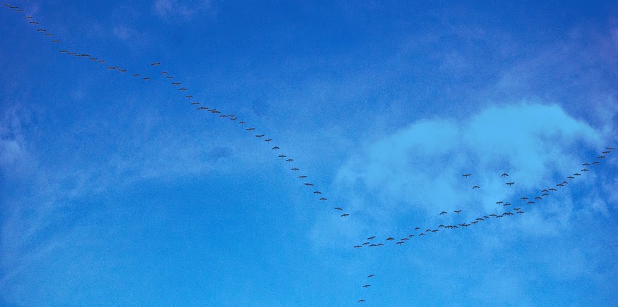 Ya hace unas semanas que hay un sonido que añadir a los habituales en Huesca. Es el de las grullas, en su viaje migratorio. Descansan en el «albergue» del embalse de la Sotonera, antes de seguir su trayecto en dirección al norte de Europa. Su tradicional vuelo en «V» se ve dificultado estos días por el fuerte viento que sopla en el valledel Ebro. Ganan altura y recuperan la formación, pero se alejan del objetivo. Habrá que estar más atento a la pórxima bandada. Supongo.