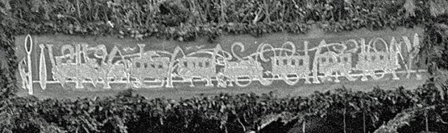 | Leyenda colgando de la marquesina de la estación. Detalle de una foto de Idelfonso Sanagustín. Fototeca de la Diputación Provincial de Huesca |