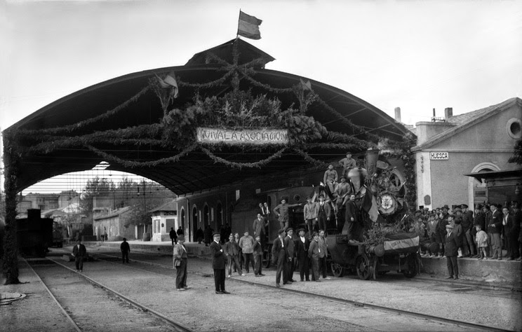 El 9 de mayo de 1925 se celebró en Huesca un festival a beneficio de la Asociación General de Empleados y Obreros de los Ferrocarriles de Españaesta mutualidad. Esta mutualidad, creada en 1888, junto a la inicial actividad asistencial amplió su labor con un montepío, centro de formación, caja de ahorros y centros de enseñanza para hijos de trabajadores. Vino una delegación nacional de la Asociación que tuvo un multitudinario recibimiento en la estación de Huesca. Sus instalaciones fueron adornadas al efecto, contando con el trabajo de Ramón Acín. El Diario de Huesca publicó una amplia información el dia siguiente. El fotógrafo Ildefonso Sanagustín fotografió la estación en esos días, incluyendo el cartel «Viva la Asociación» que, seguramente, pintaría Ramón Acín.
