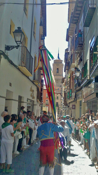 Esta foto la hizo Ana a última hora de la mañana del 10 de agosto. Evoca casi todos los elementos de la fiestas oscense por excelencia: danzantes, la basílica de San Lorenzo, blanco y verde en la ropa, albahaca. ilusión, devoción, sol, la Correría… Faltan los toros. Supongo. Felices fiestas.