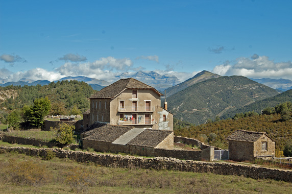 El mesón de Fuebla está junto a la carretera A-1604, cerca de Boltaña y Campodarbe. Es el último tramo de la arteria de asfalto que recorre el valle del Guarda, «la Guarguera». LIgado tradicionalmenta a la cabañera que viene del valle del Ara y se dirige al Somontano de Barbastro, el edificio actual es obra de las primeras décadas del siglo XX, según se indica en la página web del inventario del patrimonio aragonés (Sipca). Se explica, también, que funcionó como tal mesón hasta la década de los 70: «según testimonios de viajeros franceses, el antiguo mesón de Campodarve se encontraba cerrado y en ruina a finales del siglo XIX. El nuevo conjunto debió de construirse entre 1915 y 1925, según diversas fechas que constan en los pajares y otros edificios auxiliares. Estuvo en activo como mesón hasta principios de la década de 1970». Permanece habitado. Su imagen soprende la primera vez que se ve, tanto por el estado y composición del conjunto, ya que tienen todos los elemenrtos necesarios para la vida autónoma de sus moradores, como por el paisaje que lo rodea. Aquí hay un par de muestras.
