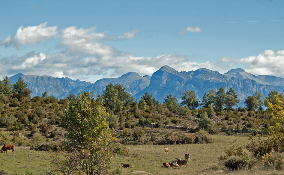 | El ganado pasta tranquilo y, al fondo, la inconfudible siliueta de la Peña Montañesa |