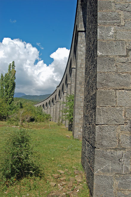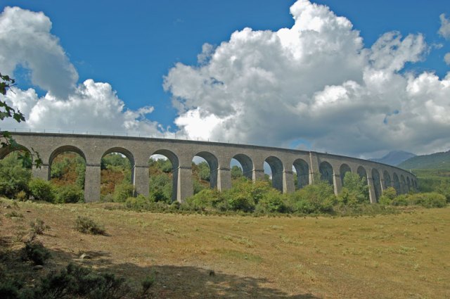 Es una de las obras de fábrica más importante de las que integran la línea del Canfranc, en su trazado de Zuera a Olorón. Está formado por veintiocho arcos de ocho metros de luz, apoyados sobre pilas de tres metros de base y dos macizos o estribos extremos. Su longitud total mide 360 metros que se desarrollan en una curva de trescientos de radio.