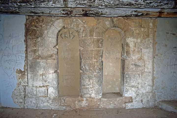 En la planta primera, coincidiendo con la fachada de la portada, se conservan los dos arcos de piedra que formarían la espadaña que coronaba este muro.