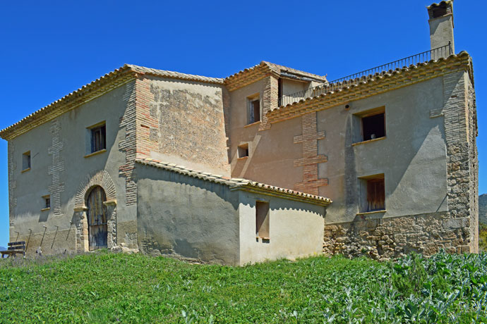 De vuelta al camino principal, apenas avanzados unos metros, hay una caseta agrícola en fase de rehabilitación. Es de pequeñas dimensiones, con portada adovelada que proviene de la ermita de Santa Águeda, según se indica en el inventario del patrimonio aragonés, http://www.sipca.es. Adosada al edificio hay una balsa construida con sillares, material usado en parte para levantar la caseta.