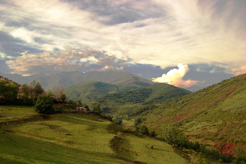 No sé qué botón he tocado del programa de imagen, pero esto ha salido a partir de una foto que hice en 2006 desde Villarroé, mirando hacia el norte. Me parece. Villarroé es una aldea ribagorzana del municipio de Laspaúles, junto al que se levantan sus viviendas e iglesia. Llegamos por la N-260, tramo Castejón de Sos-Montanuy.