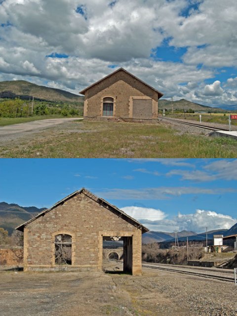 El importante patrimonio arquitectónico de la línea de ferrocarril Huesca-Jaca está desapareciendo poco a poco. La falta de uso para el que fue concenbido hace que no haya mantenimiento y de ahí llega, luego, la ruina. Pero hay casos y casos. En Caldearenas hay un almacén que se ha convertdio en local polivalente y en la estación de Santa María y La Peña hay uno que está en ruinas. Son de la misma época. Entraron en servicio en junio de 1893.