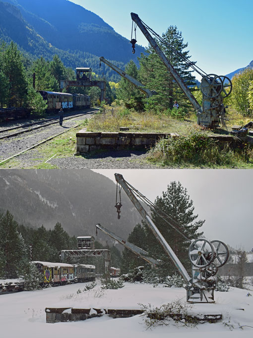Canfranc (15 octubre 2106 y 2 diciembre 2017) Cómo puede cambiar la imagen de un mismo lugar según la estación del año. Aunque se mantiene la misma melanconlía de hace tiempo, puede que ahora estemos cerca de que cambie. ¡Ójala! (Me parece).
