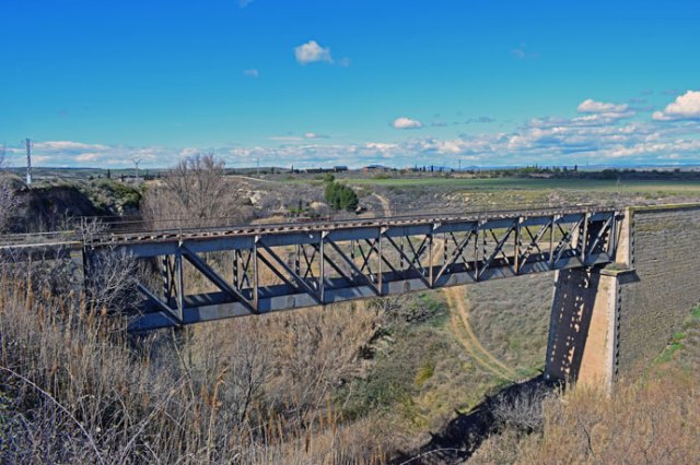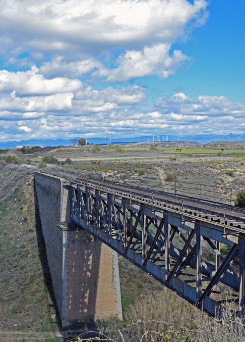 Pasear por una línea de ferrocarril abandonada no parece muy atractivo. Alguna traviesa grisácea y llena de arrugas en una postura inverosímil, el escaso balasto que permanece en su sitio, la línea recta que se adivina pese a la ausencia del material… pero a la vez hay sorpresas como este puente. Está en la línea Zuera-Turuñana, sobre el río Sotón, cerca de Gurrea de Gállego. Allí sigue en pie, como esperando esa ansiada reapertura de la línea Zaragoza-Pau por Canfranc.