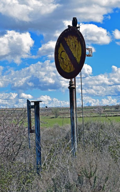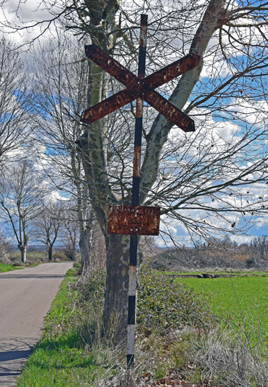 Más difícil lo tiene la señal que avisa sobre la cercanía de un paso a nivel sin barreras. Se adivina por la forma de la señal. Al otro lado del camino la cosa está peor. El árbol ha crecido justo delante de la señal, anulando su posibilidad de servicio. Ojo al tren.