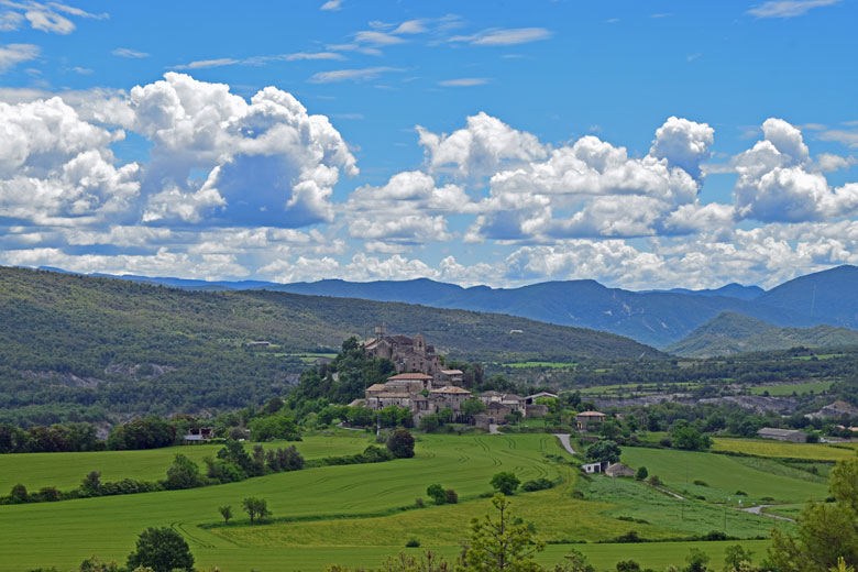 Vamos por la parte superior de este cerro y, a la hora de estar caminando, llegamos a la ermita de la Virgen de la Sierra. Desde lo alto vemos Boltaña, a lo lejos, y más cercanos, algunos caseríos del valle del Sieste. Subiendo, hemos disfrutado de vistas casi aéreas de Guaso, Latorrecilla y, a lo lejos, el puntiagudo cerro donde estaba el castillo de Buil.