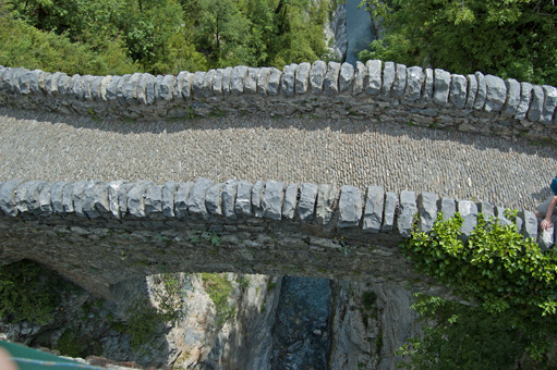 El camino está señalizado y permite añadir recorridos de más longitud, aunque en este caso nos vamos a quedar en el más sencillo, pero muy sugerente por diversos motivos. Nada más empezar nos encontramos con el puente de San Úrbez sobre el río Bellós. Está construido en la parte superior de una cortada de altura más que considerable. He leído en diversas publicaciones que hay 30, 40 ó 50 metros entre el agua y el paso, mucha distancia en cualquier caso.
