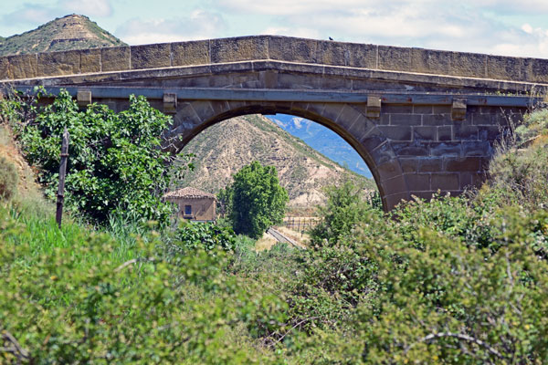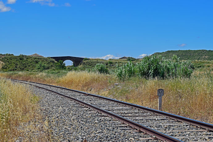 Todas estas zarzas del primer plano ocupan el espacio que correspondería al último tramo de la línea Zuera Turañana, cuando se llega a la venta del mismo nombre y queda a lo lejos la estación en la que acababa esta comunicación. El puente salva la trinchera del ferrocarril para comunicar la vivienda con los edificios auxiliares de la venta de Turuñana.