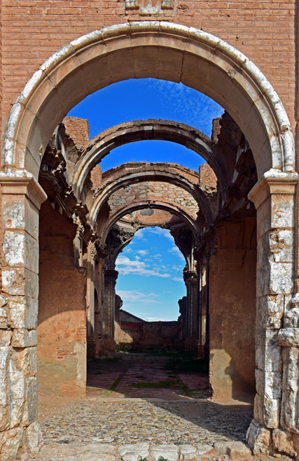 La primera visita a Belchite viejo puede sorprender al viajero. Ha visto imágenes, reportajes, comentarios… ha visto sus ruinas en películas, pero pasear por sus calles de hundidas viviendas no es lo mismo. Además, si te lo cuenta una joven guía que vive con intensidad todo lo que padecieron aquí sus habitantes en la última guerra civil española, el marco para la emoción es completo.