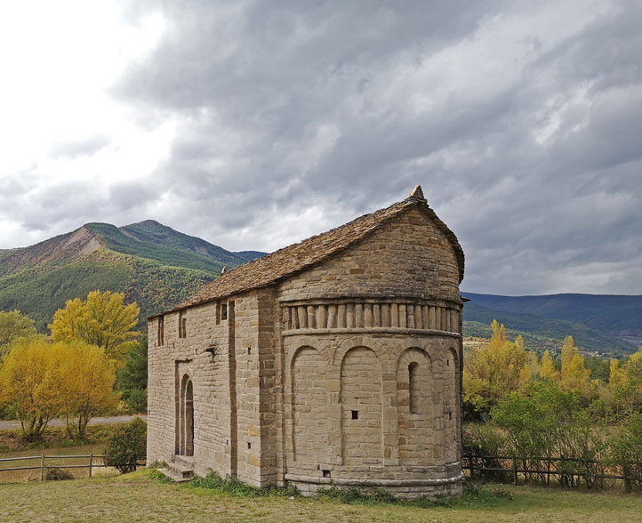 Un poco de color otoñal, tras un tiempo de silencio. Paraje de difícil de catalogar, algo más que una ermita. San Juan de Busa, entre Oliván y Lárrede, en tierras de Sabiánigo y Biescas, Alto Gállego. Acceso asfaltado.