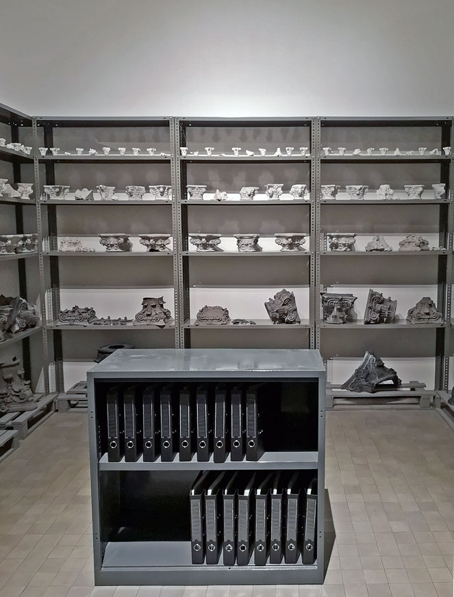 Una sala con abundantes restos de capiteles e información técnica sobre ellos comparte espacio con esos elementos reelaborados. De ahí la necesidad de someter a crítica la pretensión de la verdad esencial e irreductible o gestionar la pluralidad, la escucha y recepción de relatos silenciados. Antes de terminar, el artista plantea una última pregunta a quien visite su muestra: «¿cómo se articulan las relaciones entre saber y poder en los espacios institucionales de conocimiento?