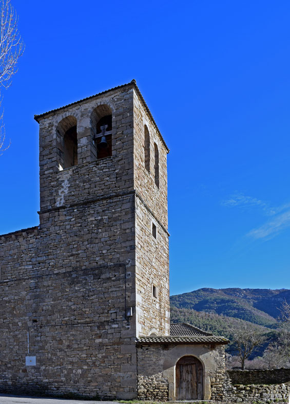 Me encuentro con una señora en la calle por la que he llegado a Javierre. Le comento que he estado en Satué, que me ha llamado la atención el lavadero y el horno, aparte de la iglesia, claro. Me dice que en Javierre no hay tantas cosas para ver. Debe bromear porque lo dice delante de su casa, Casa Oliván, con una espectacular fachada de piedra del siglo XVII, coronada por una recia chimenea circular típica del Pirineo. Hay que venir a Javierre del Obispo, aunque solamente sea para ver esta casa… y los dos mastines que la protegen. No lejos de aquí, ocas y gallinas alborotan levemente el silencio del conjunto. Esta señora me comenta cómo han restaurado sus hijas la casa y me indica algunas fechas que lucen en las puertas de las tres partes diferenciadas que tiene el edificio.