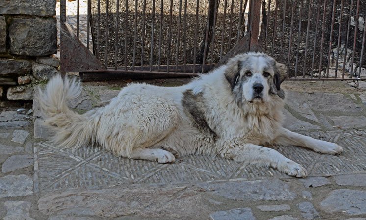 Dos mastines de concurso acompañan al turista en su paseo para fotografiar la fachada. Como estamos a finales de año, nos deseamos una feliz navidad con mi informante y un próspero año nuevo. La señora entra en su casa y los canes observan al visitante hasta que desaparece por la esquina de la casa.
