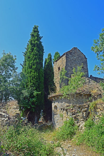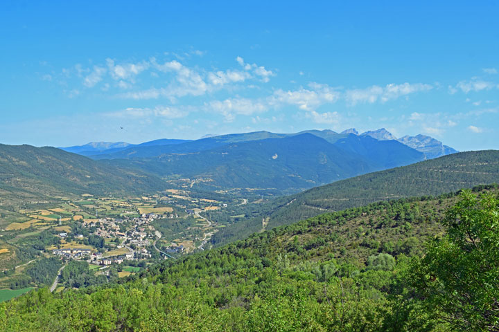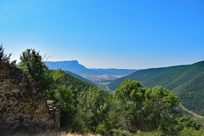 El sendero va ganando altura y las vistas del entorno entretienen al paseante. Pinos, quejigos, boj… pasamos por algún tramo empedrado del viejo camino que de Bergosa bajaba al valle y, en media hora más o menos, divisamos ya, a lo lejos, los primeros muros de nuestro destino de hoy.