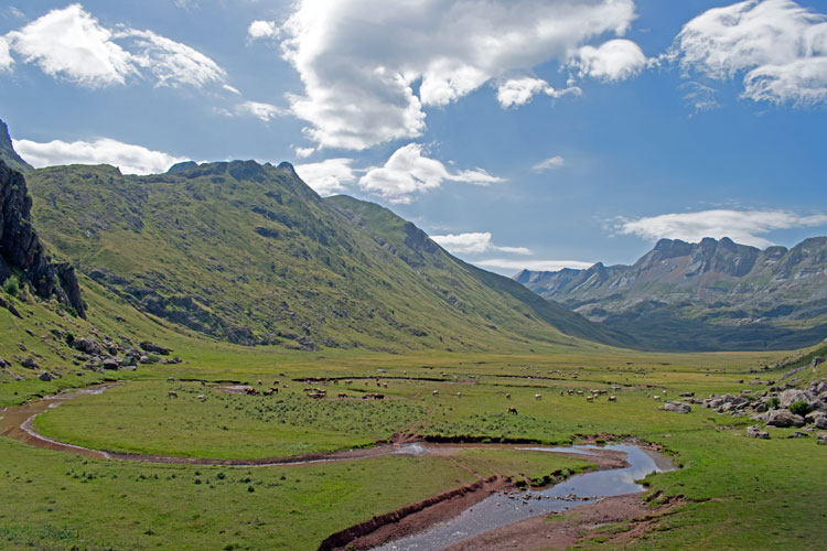 Caballos, vacas, el río serpenteando por el amplio espacio que le dejó el glaciar… senderistas varios, no falta nada. Estamos en Aguas Tuertas. Los meandros que ha tajado el Subordán en su lento avanzar componen su imagen más icónica (como se dice ahora).