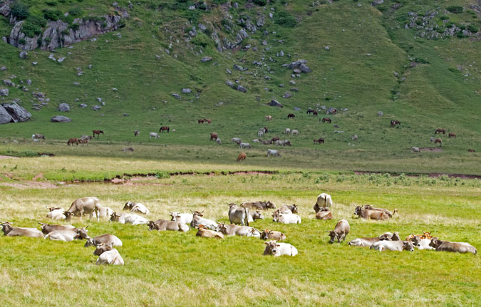 Hay gente que no pasa de este punto elevado respecto al río. Recorrer este valle un rato supone un atractivo más antes de parar en una roca plana que te sirva de improvisado merendero. Compartirás el tiempo del almuerzo con vacas y caballos, que seguirán a lo suyo, tras una breve mirada. Más turistas.