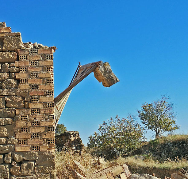 La madera de la hoja de una ventana presenta una preocupante inclinación y un giro parcial que le asegura poco futuro. Por un lado, la fallleba que siempre le ha permitido cerrar bien la habitación, le mantiene recta en esa preocupante inclinación. Al otro lado, un sillar -o más de uno- de buen tamaño, con su peso, provoca un giro extraño. Así, la madera ni cae por esta fuerza, ni recupera la verticalidad de antaño.