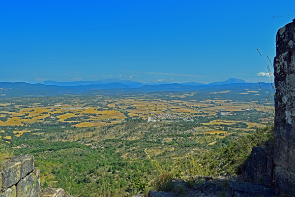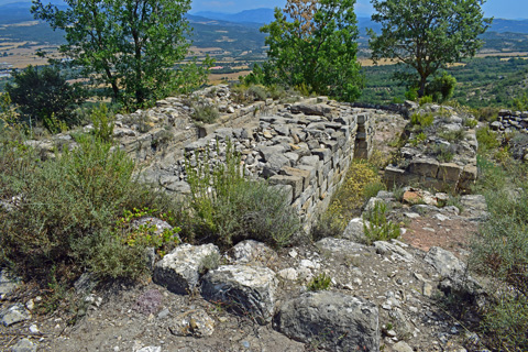 En la página web Románico en Ribagorza y en el blog Románico aragonés hay también imágenes e información de nuestra última parada de esta mañana: las ruinas de la ermita de Santa Eulalia. Se conserva la planta, como un dibujo de un manual, y las piedras que se han caído de su sitio ordenadas en la nave, como sucede en San Martín. Hay unas pocas filas de sillares en todo el perímetro del templo, con la zona del ábside semicircular más deteriorada porque allí hay un fuerte desnivel. En donde estaba la portada está todavía la piedra con la hendidura semicircular que permitía girar la puerta.