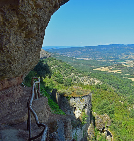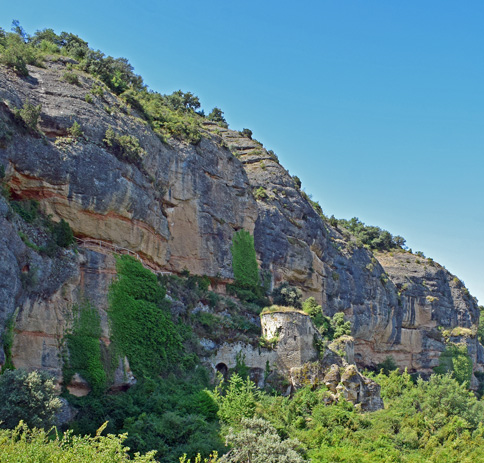 Poco antes de llegar al destino de hoy, en un giro del sendero, se observa el conjunto de San Martín, encajado en la roca de la sierra. Su imagen lejana ya despierta la imaginación por lo sorprendente de su ubicación. Parece imposible levantar un edificio en un lugar tan agreste.