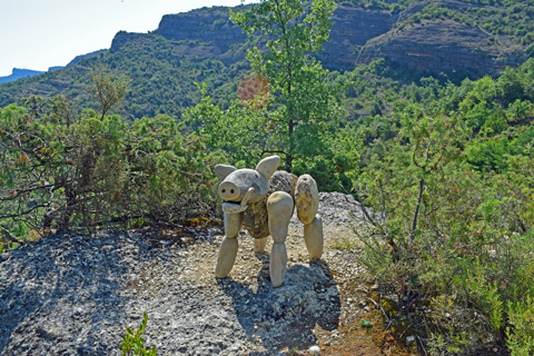 Caminamos durante 1,7 kilómetros por pista y 1 kilómetro por el sendero PR-HU 124. El paseo es agradable en todo momento, salpicado con esculturas de piedra local realizadas por Joaquín Sesé. Peces, insectos, aves… hasta un cocodrilo. Hay también una imagen escatológica de un varón, un pastor con sus ovejas, un Nacimiento y un nido de rapaces que piden respeto.