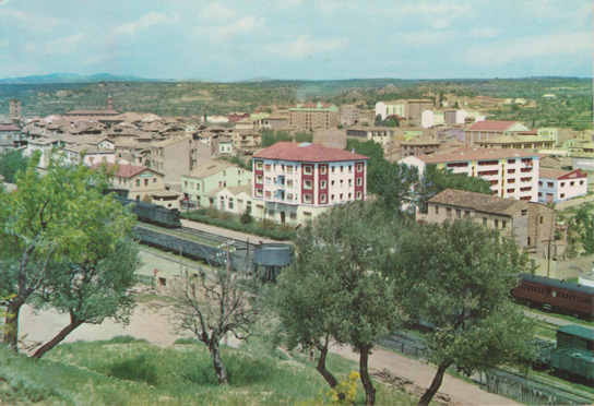 La postal era la nº 100 de Ediciones París – J.M.J. – Zaragoza. Es una imagen parcial de la estación de ferrocarril de Barbastro. Quien sea persona aficionada a los trenes reconocerá seguramente elementos del parque móvil que no tapan los árboles. Si no es así, nos quedaremos con las ganas.