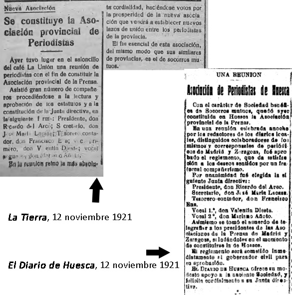 En noviembre de 1921 nació la Asociación Provincial de Periodistas de Huesca. Agrupó a las firmas más destacadas de la prensa oscense, abarcando todo el espectro ideológico y político. Así, fueron presidentes Ricardo del Arco y Saúl Gazo. José María Lacasa fue el permanente secretario y en la tesorería, vocalías o como asociados figuraron nombres como Francisco Ena, Manuel Casanova, Manuel Banzo, Leandro Pérez Barón, Valentín Dieste, Mariano Añoto o Adolfo Aquilué, entre otros. Ramón Acín participó en sus iniciativas desde el primer momento.