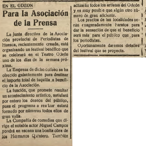 Sus primeros pasos se dirigieron a la organización de un festival artístico en colaboración con los empresarios del Odeón, para recoger fondos con los que desarrollar su actividad.[2] Fue el día 29 a las seis de la tarde. «Como ya hemos anunciado, esta tarde, a las seis, se celebra en el Odeón el festival a beneficio de la recién constituida Asociación Provincial de Periodistas de Huesca».[3]