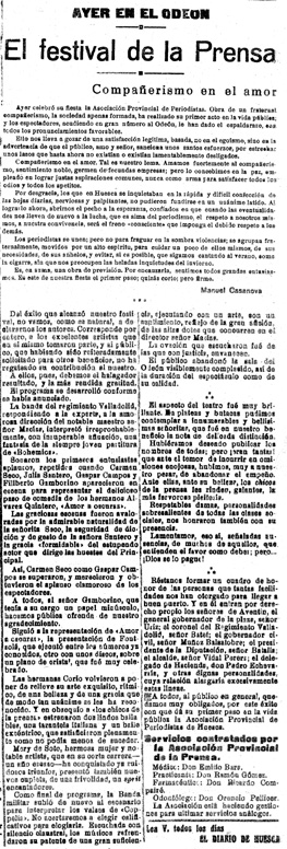 Manuel Casanova firmó el prólogo de la información sobre la recién constituida asociación y el festival artístico del día 29: «los periodistas se unen; pero no para fraguar en la sombra violencias; se agrupan fraternalmente, movidos por un alto espíritu, para cuidar un poco de ellos mismos, de sus necesidades, de sus anhelos, y evitar, si es posible, que sigamos cantando al verano, como la cigarra, sin que nos preocupen las heladas inquietudes del invierno». Casanova afirmaba posteriormente que es una «obra de previsión» y que este primer paso lo consideraba «quizás corto, pero firme».[4]