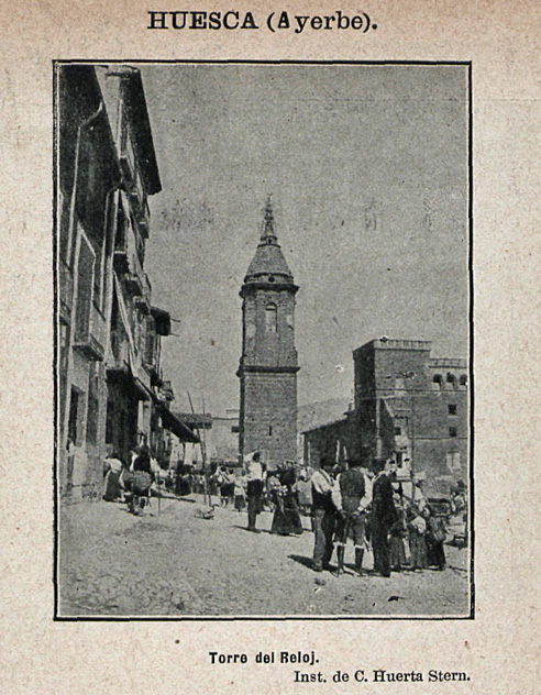 Esta imagen de Ayerbe se publicó en la revista madrileña Instantáneas el 9 de diciembre de 1899. Lleva por título «Torre del reloj». Figura firmada por C. Huerta Stern. Esto es lo que se puede saber viendo esta publicación de finales del siglo XIX. Ahora entra la imaginación. Podría ser un día de feria. Personas con las vestimenta tradicional aragonesa y alguno de una de manera más moderna para su época conversan en una soleada mañana. Cerca, hay unos niños. Junto a la torre hay más personas. Está animada la plaza. Al fondo comparten protagonismo la citada torre del reloj y el palacio del marqués.