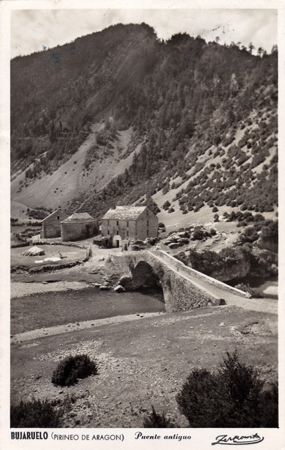 Tranquila imagen de San Nicolás de Bujaruelo en una mañana de colada, probablemente años 30 del siglo pasado por la firma que presenta la postal: Zerkowitz. Se ven tres edificios de esta «área de servicio» pirenaica. La era está perfectamente marcada (una señora extiende sobre la hierba la ropa lavada para que se seque), el puente sobre el Ara… testimonio de una forma de vivir que cambiaría pocos años después.