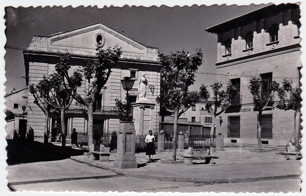 Es una postal de Ediciones Sicilia, de Zaragoza, y lleva el número 40: «Huesca. Plaza de Calvo Sotelo». Está al fondo el teatro Principal y, a la derecha, la oficina principal de la Caja de Ahorros y Monte de Piedad de Zaragoza, Aragón y Rioja. Tras estas dos referencias, se ven diversas construcciones más sencillas. En el centro de la plaza figura la imagen de la Inmaculada que sigue presidiendo este espacio actualmente. Data de 1954 y es obra de Fructuoso Orduña.