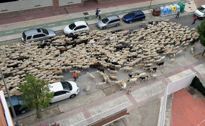 Paso por Huesca de un rebaño hacia la montaña esta mañana. Trashumancia en tiempos de metaverso. Hace un año subieron el 1 de julio y hace diez, el 29 de junio.