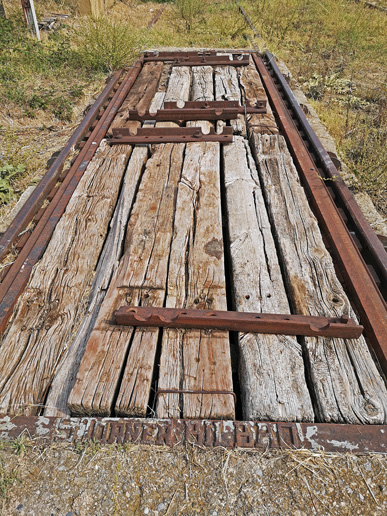 Aquí, olvidada, está una fabricada por la empresa S. Torner, de Bilbao, fundada en 1880. La que hay aquí es una «báscula puente con cubilage (marco de la plataforma) de hierro para ferrocarril en línea continua», según reza la publicidad de la época. En un lateral corto del marco figura «S. Torner. Bilbao» y en el otro «Renfe».