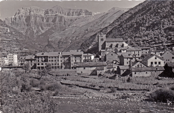 Una vista de Broto con el perfil más conocido de Ordesa como telón de fondo. Junto a las viviendas más antiguas y la silueta de la parroquial coronando el conjunto urbano, se ven nuevas construcciones. Este entorno entró pronto en el mundo el turismo por el atractivo que suponía el parque nacional. La mayor altura de los edificios en obras habla de un uso turístico.