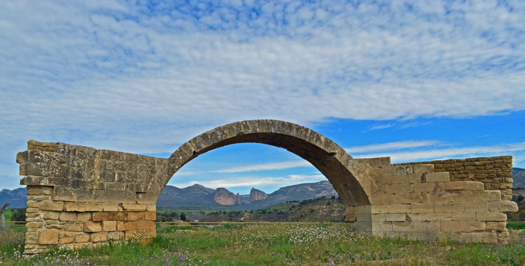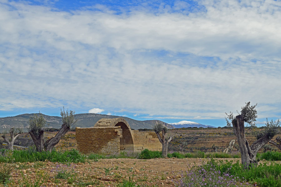 Plantas silvestres y escuetos olivos son compañeros de viaje en una época distinta a la de su construcción o a la del dilatado tiempo de utilidad con gentes y mercancías de uno al otro lado del río de nombre romano. Abajo, para sorpresa de incrédulos, el embalse de Montearagón atesora la mitad de su capacidad de embalse. Está proceso de carga para ver cómo responde la obra. Al fondo, Guara, con la cumbre blanca tras las últimas nevadas, vigila. Aunque no lo parezca.